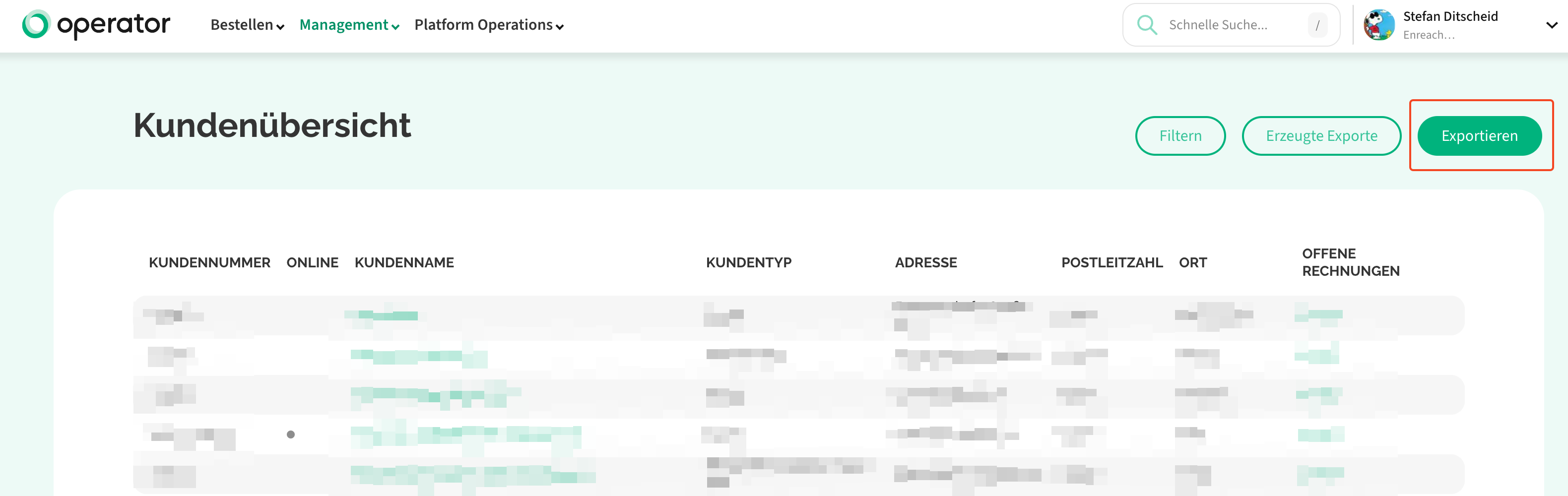 Im Operator können Sie via Menü Management/Übersicht Ihren Kundendatenstamm in eine Excel-Datei exportieren. Bisher wurde das Excel 2003 (.xls) Format hierzu verwendet.