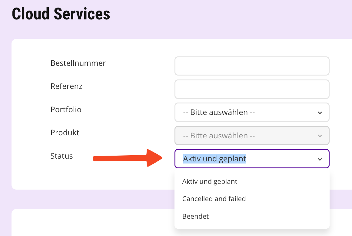 • In der Übersicht der Cloud Services Bestellungen kann nach dem Status gefiltert werden PSO-5746