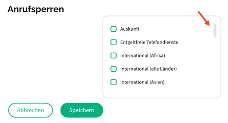 - Der Dialog der Anrufsperren zeigt jetzt immer einen Scrollbar, damit sofort deutlich wird, dass mehr als die angezeigten Sperrmöglichkeiten vorhanden sind OFE-2492
